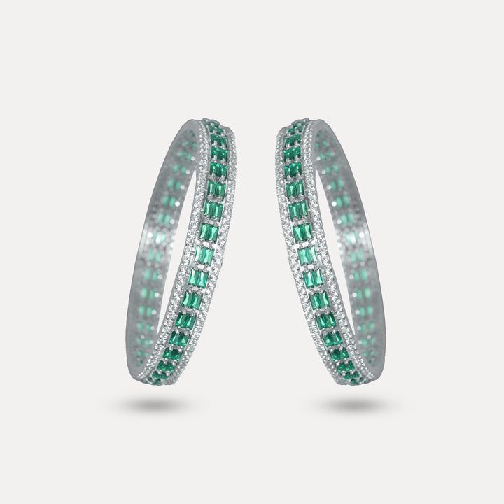 - These 925 Sterling Silver These sleek sterling silver bangles are adorned with a continuous row of baguette-cut emerald-green stones, bordered by sparkling zirconia for a radiant finish.
