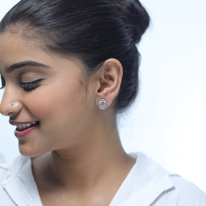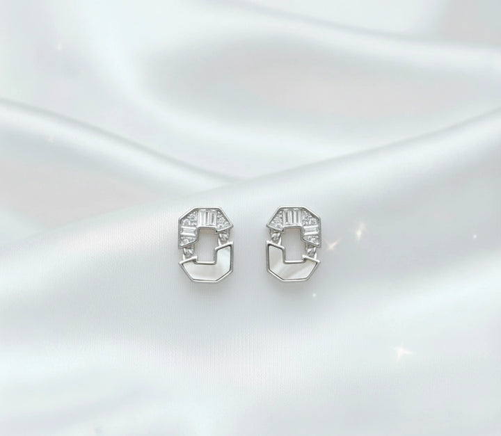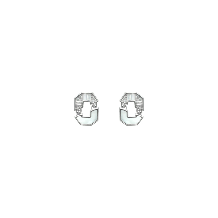- These 925 Sterling Silver feature a geometric design with sleek silver-toned metal, accented by baguette and round-cut crystals and a smooth, white inlay.