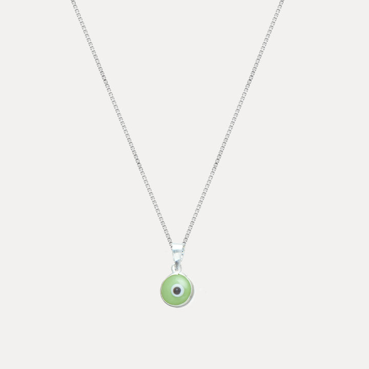 - These 925 Sterling Silver A simple and elegant silver chain with a green evil eye pendant that brings protection and positive energy. Perfect for daily wear or gifting.