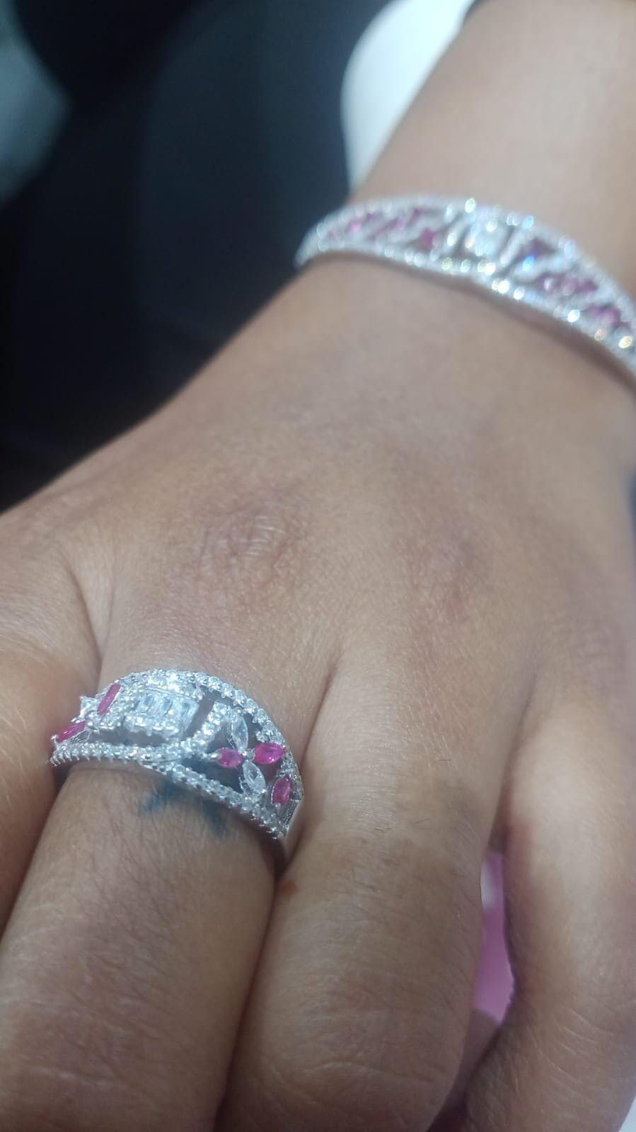 Silver Luxurious Pink Floral Bracelet with Ring Set