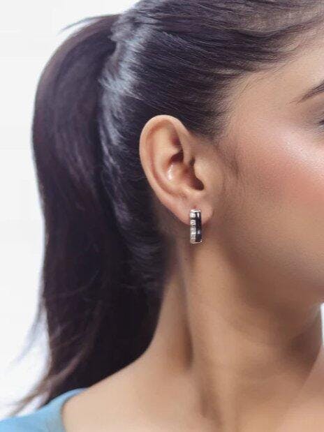- These 925 Sterling Silver showcase a deep noir base accented with glimmering square stones, all held within a sculpted rose gold silhouette.