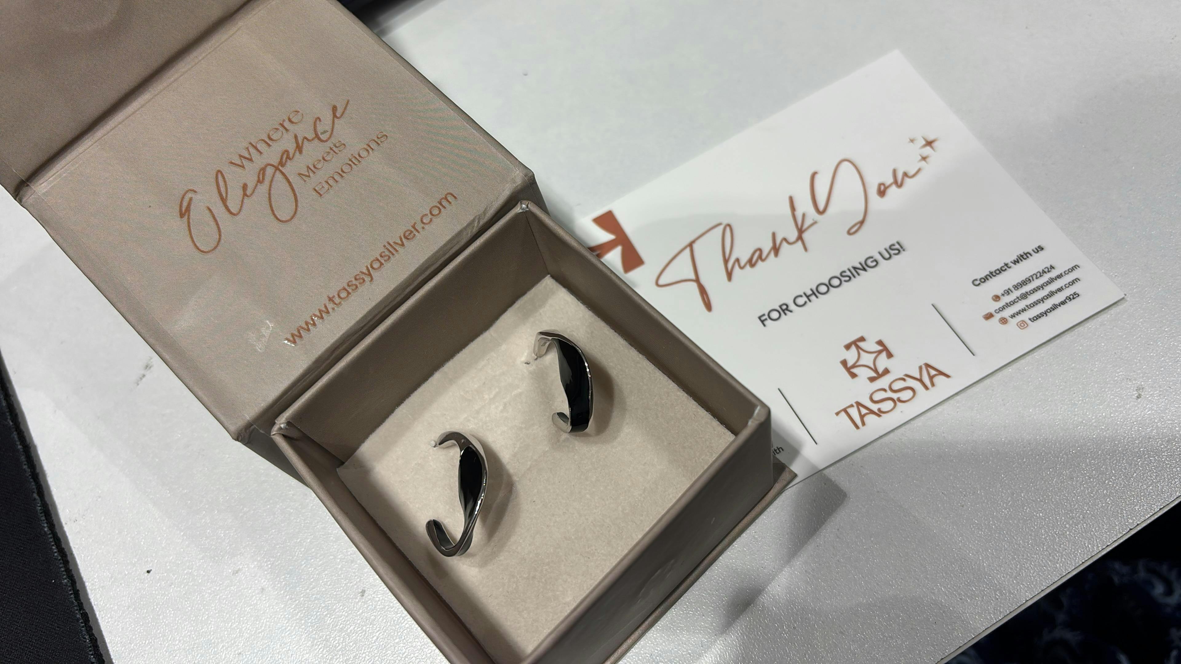 - These 925 Sterling Silver dipped in sleek black enamel, their asymmetrical silhouette mimics the effortless flow of waves.