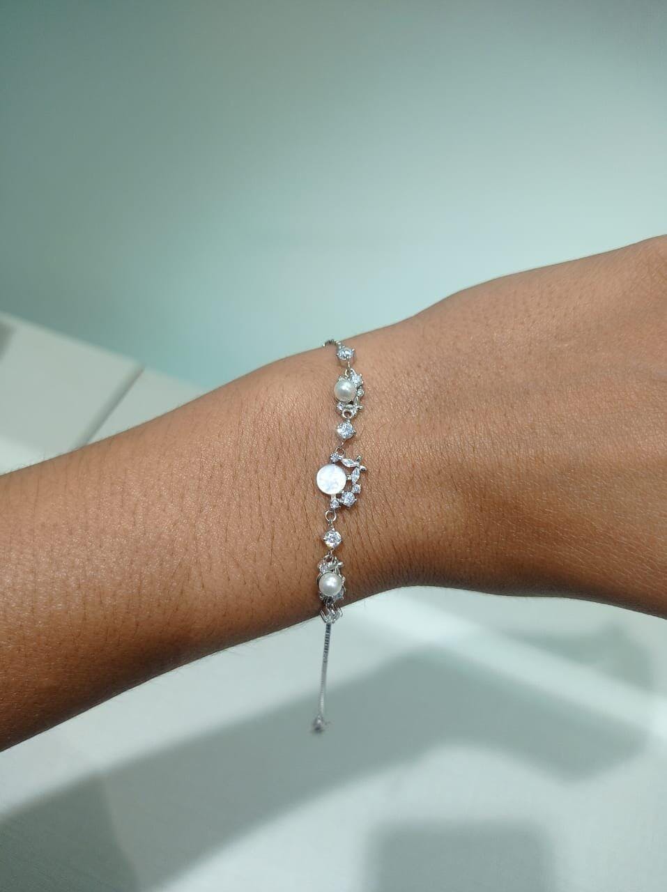 - These 925 Sterling Silver This bracelet features luminous pearls nestled among shimmering crystals on a delicate silver chain. A classic piece that exudes timeless beauty and effortless grace.