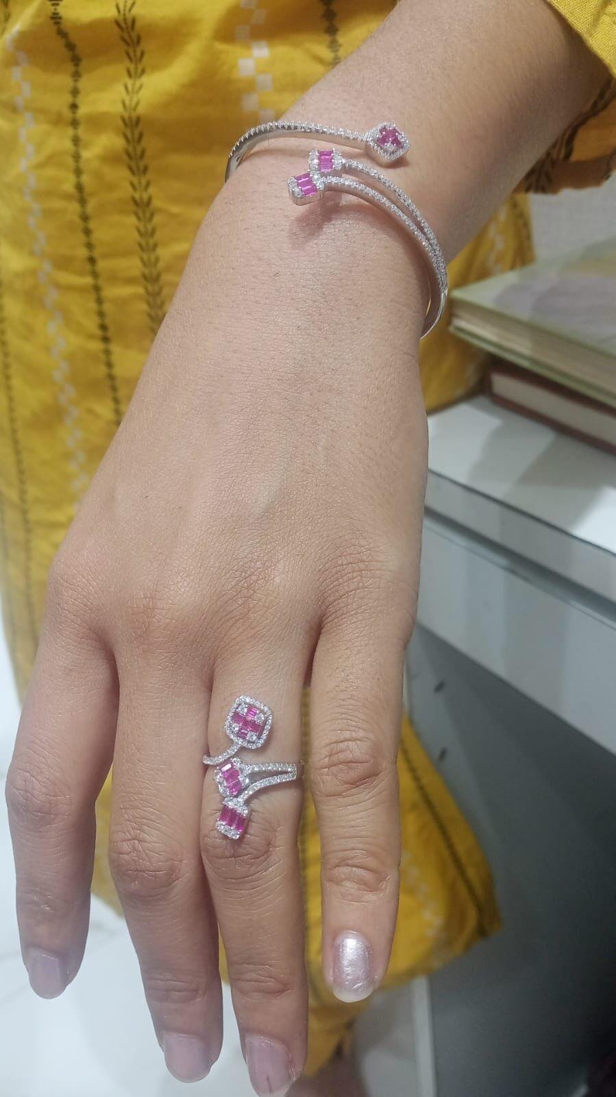 - This 925 Sterling Silver kada features with pink diamond twirling grace .