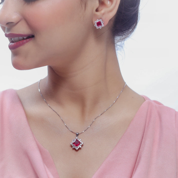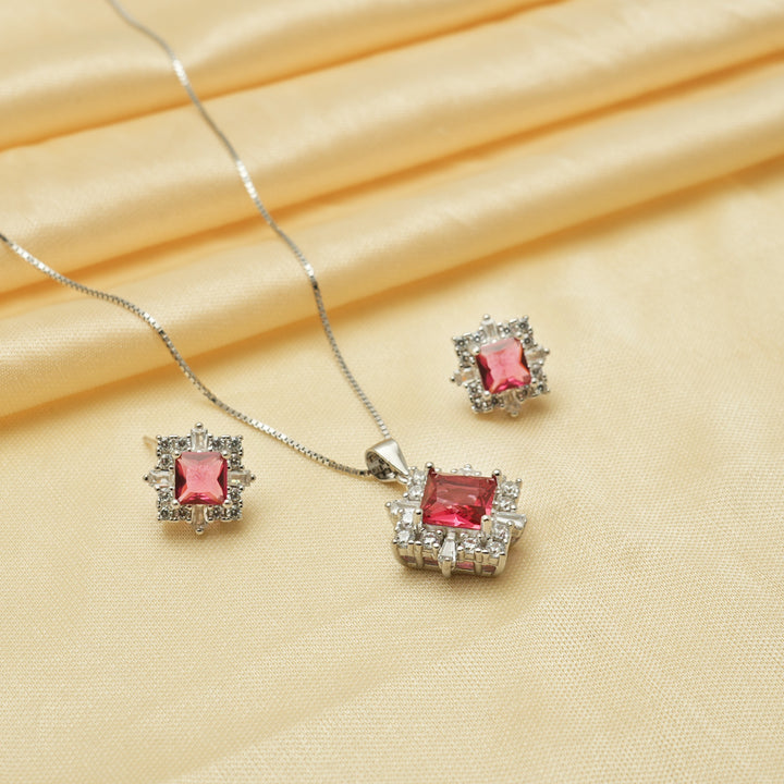 - These 925 Sterling Silver featuring a radiant square-cut pink stone pendant and matching tops. The vivid pink centrepiece is framed with sparkling cubic zirconia in a starburst design, making it both elegant and eye-catching.