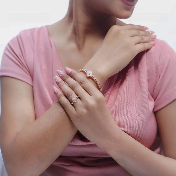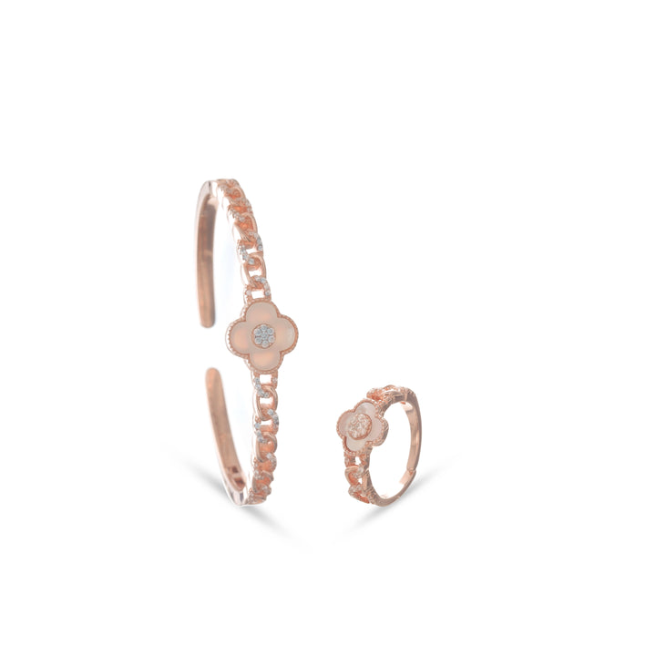 - These 925 Sterling Silver With a soft rose gold finish and flower-studded sparkle, this kada and ring set is a timeless piece for your jewellery collection.