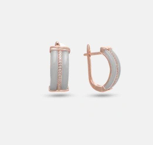 - These 925 Sterling Silver feature a lustrous white enamel curve embraced by a sleek rose gold frame. The centre is adorned with a fine line of glistening zirconia, adding just the right amount of sparkle.