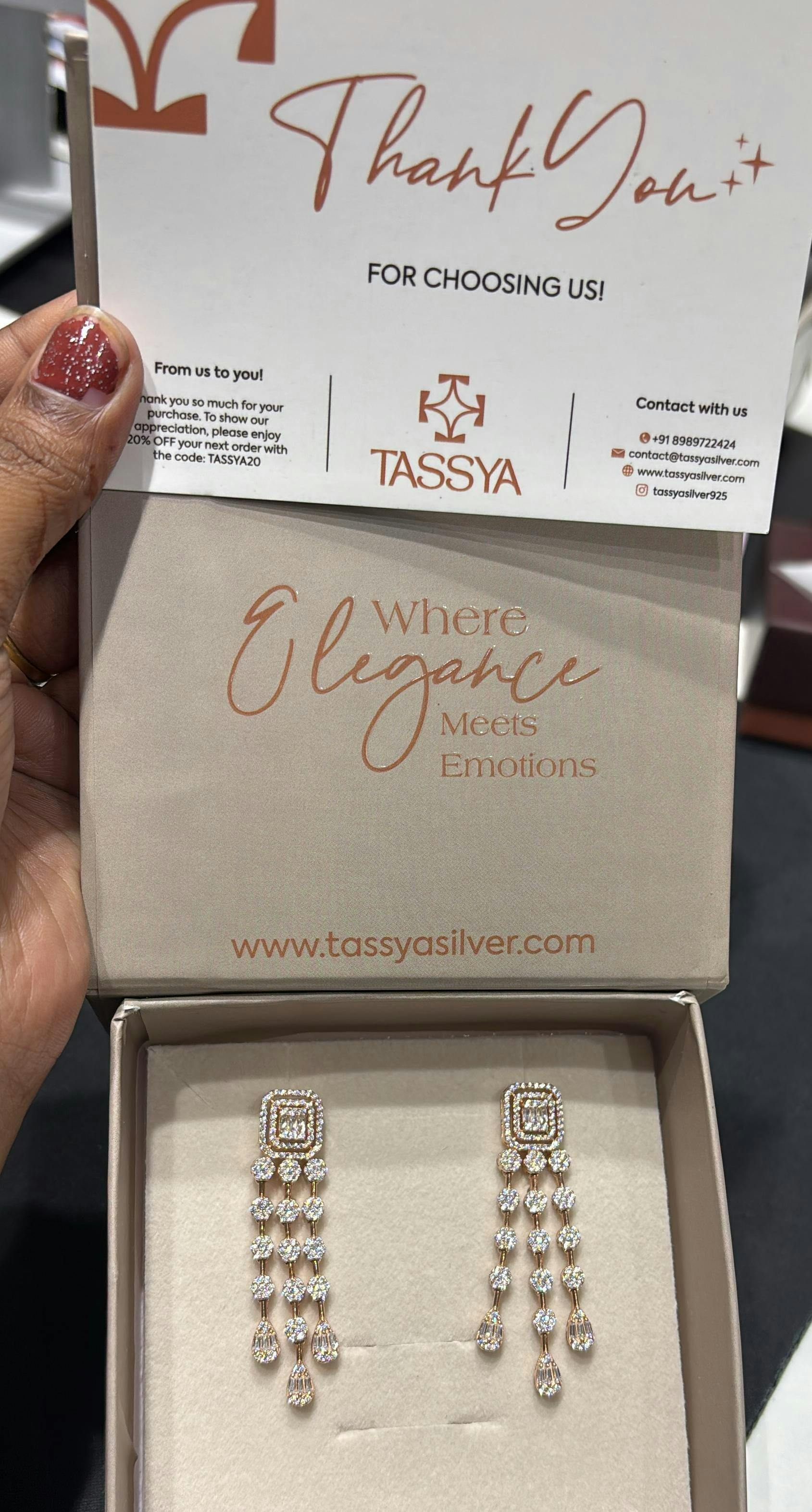 - These 925 Sterling Silver Featuring dazzling baguette and round-cut stones set in rose gold, these statement earrings fall like cascading droplets of luxury.