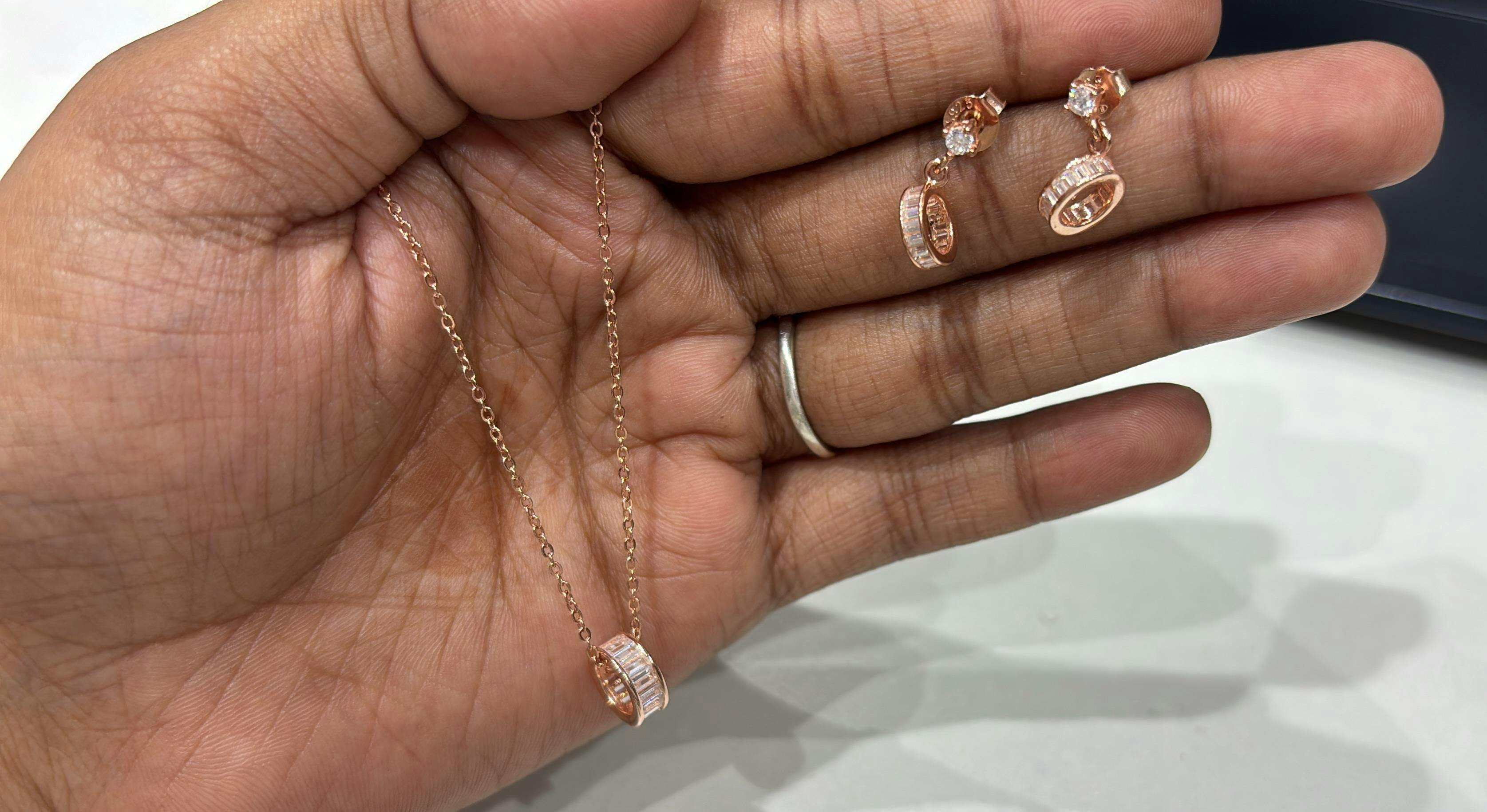 - These 925 Sterling Silver a chic rose gold necklace and earrings set featuring shimmering baguette-cut stones for a refined, timeless look.