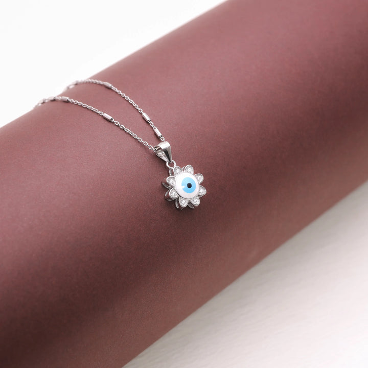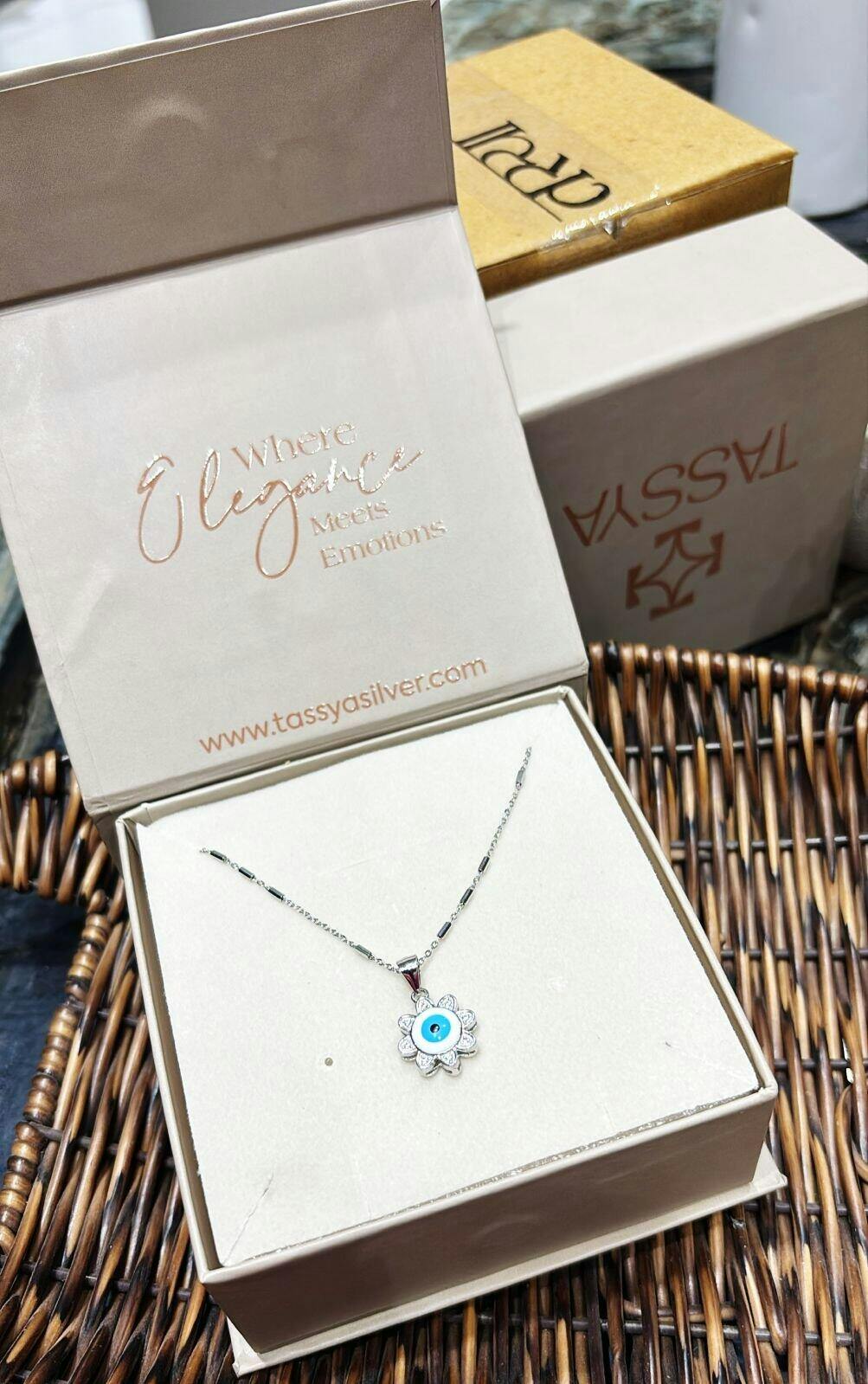 - These 925 Sterling Silver featuring a delicate floral design and a protective blue evil eye at its heart.