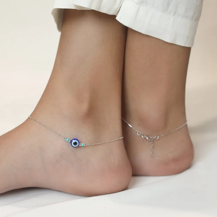 - These 925 Sterling Silver A delicate anklet featuring a striking blue evil-eye charm with tiny bead accents. Stylish and protective, perfect for everyday wear.
