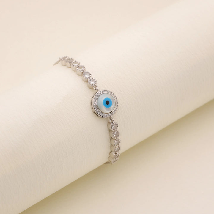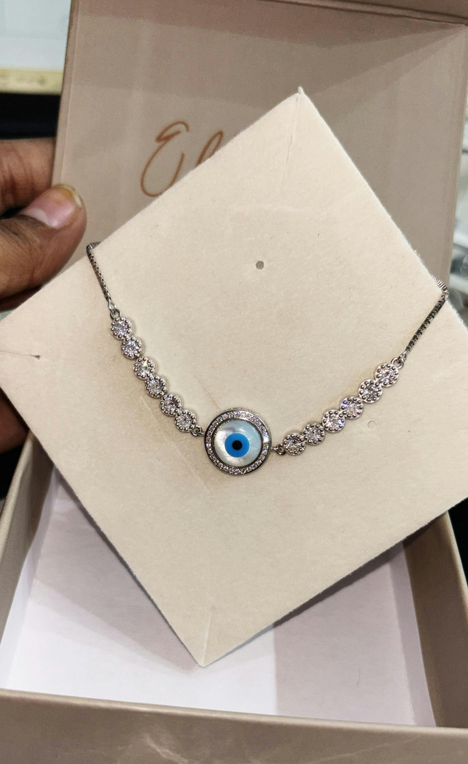 - These 925 Sterling Silver featuring a sparkling evil eye charm at its center, framed by dazzling stones for a minimalist yet striking look. Wards off negativity with refined elegance.