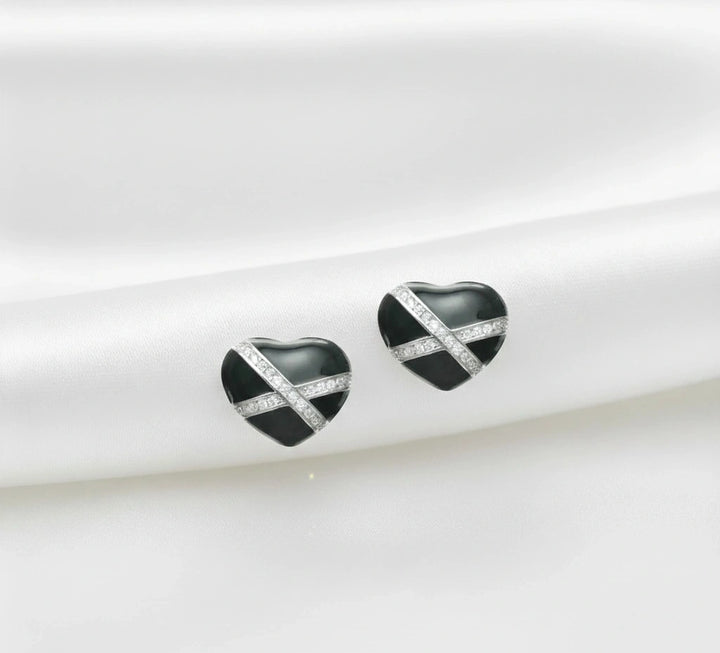 - These 925 Sterling Silver A glossy black heart is adorned with intersecting rows of sparkling crystals, adding a touch of glamour to a classic symbol