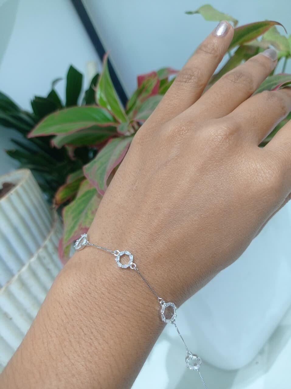 - These 925 Sterling Silver features a series of linked crystal-studded open circles, offering a sleek geometric appeal.