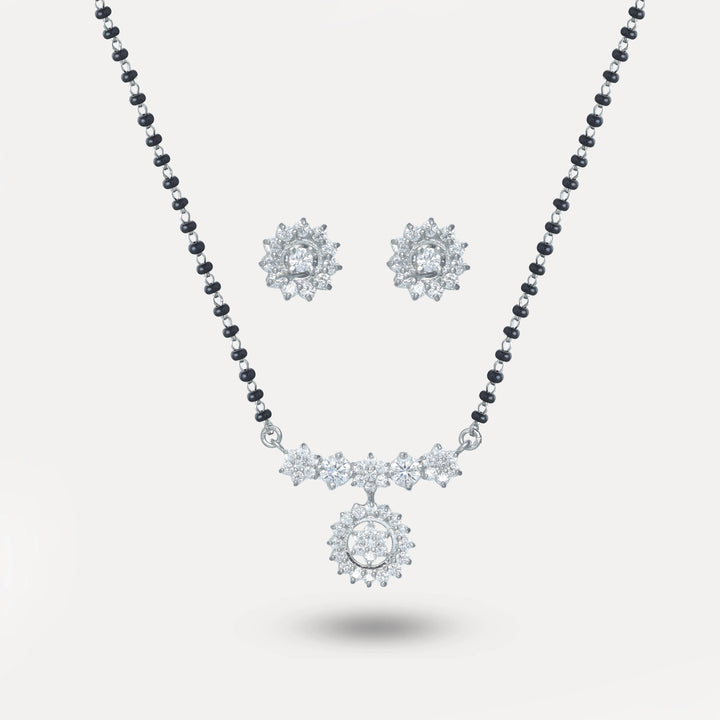 - These 925 Sterling Silver. set is crafted in sterling silver, adorned with sparkling zirconia stones arranged in a floral pattern, Paired with matching floral earrings.