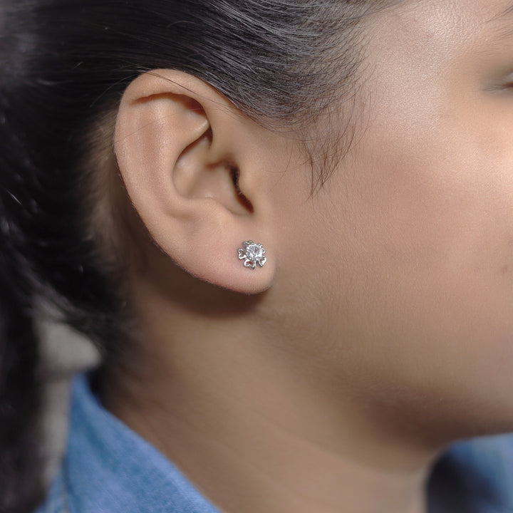 - These 925 Sterling Silver earrings feature a stylized flower design radiating elegance, with a brilliant centre stone adding a touch of sparkle.