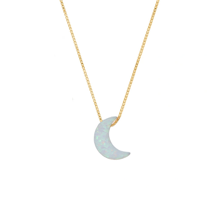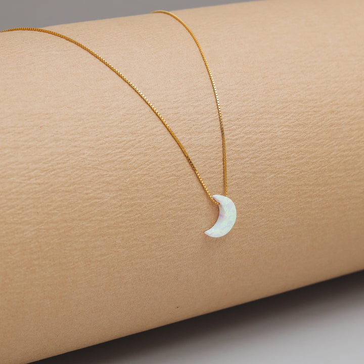 - These 925 Sterling Silver features a luminous crescent moon crafted in a shimmering opal-like finish, gracefully paired with a radiant gold-plated chain.