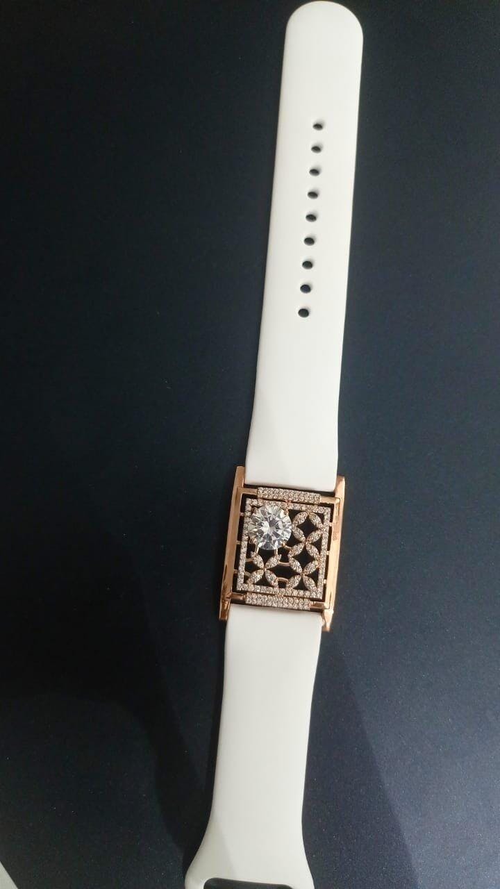 - These 925 Sterling Silver A watch with an ornate floral-inspired rectangular design and a gemstone accent, set against a clean ivory white band.