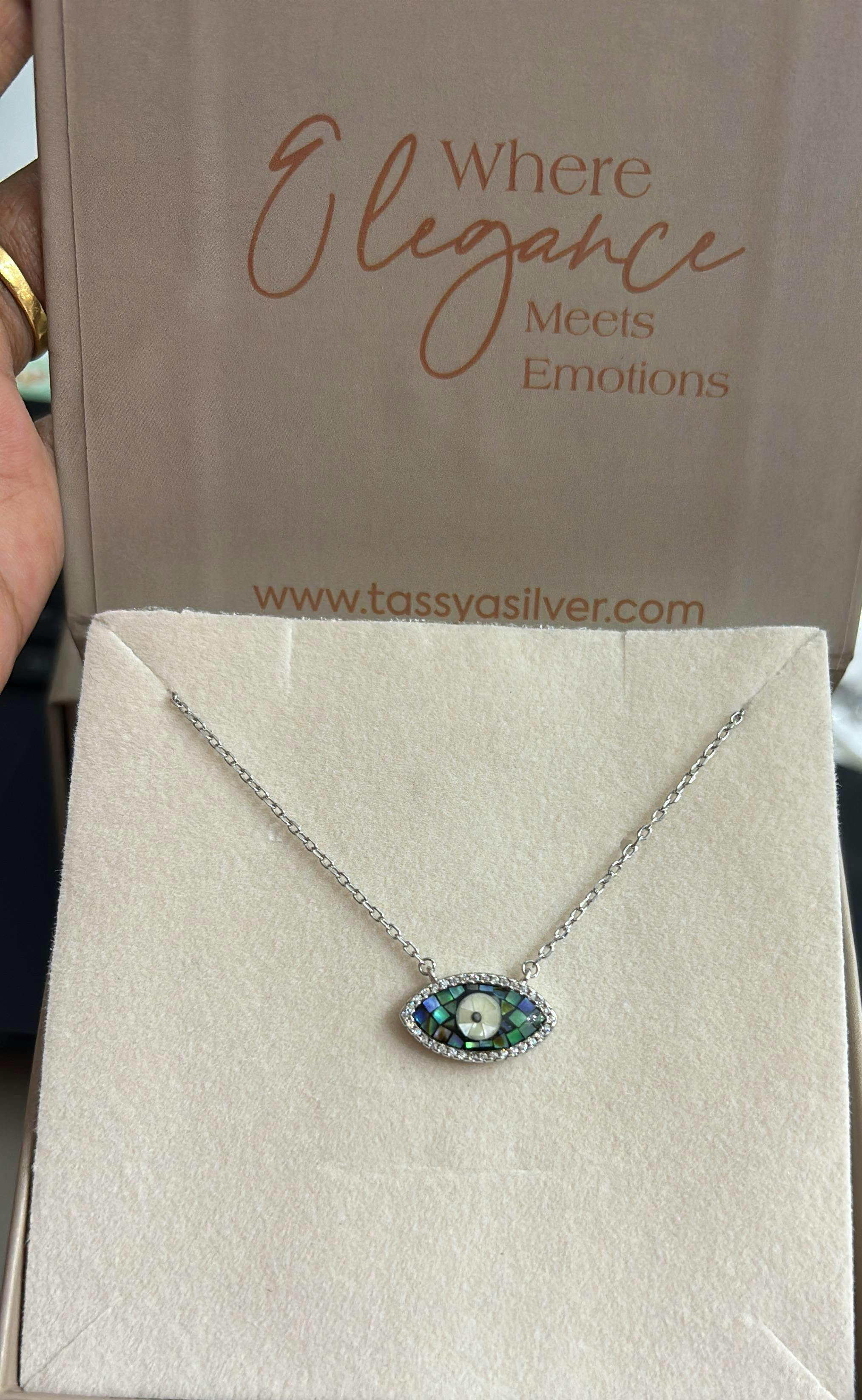 - These 925 Sterling Silver features a mosaic evil eye crafted with iridescent tones and sparkling accentsāperfect for a bold, stylish statement.