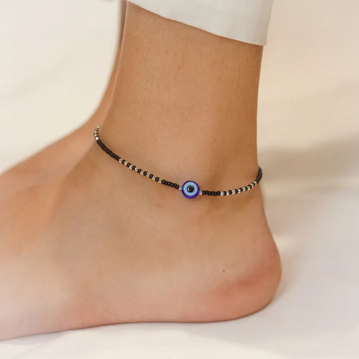 - These 925 Sterling Silver A sleek anklet crafted with fine black beads and a bold evil-eye charm at the center. Designed to protect while adding a stylish touch to your everyday look.