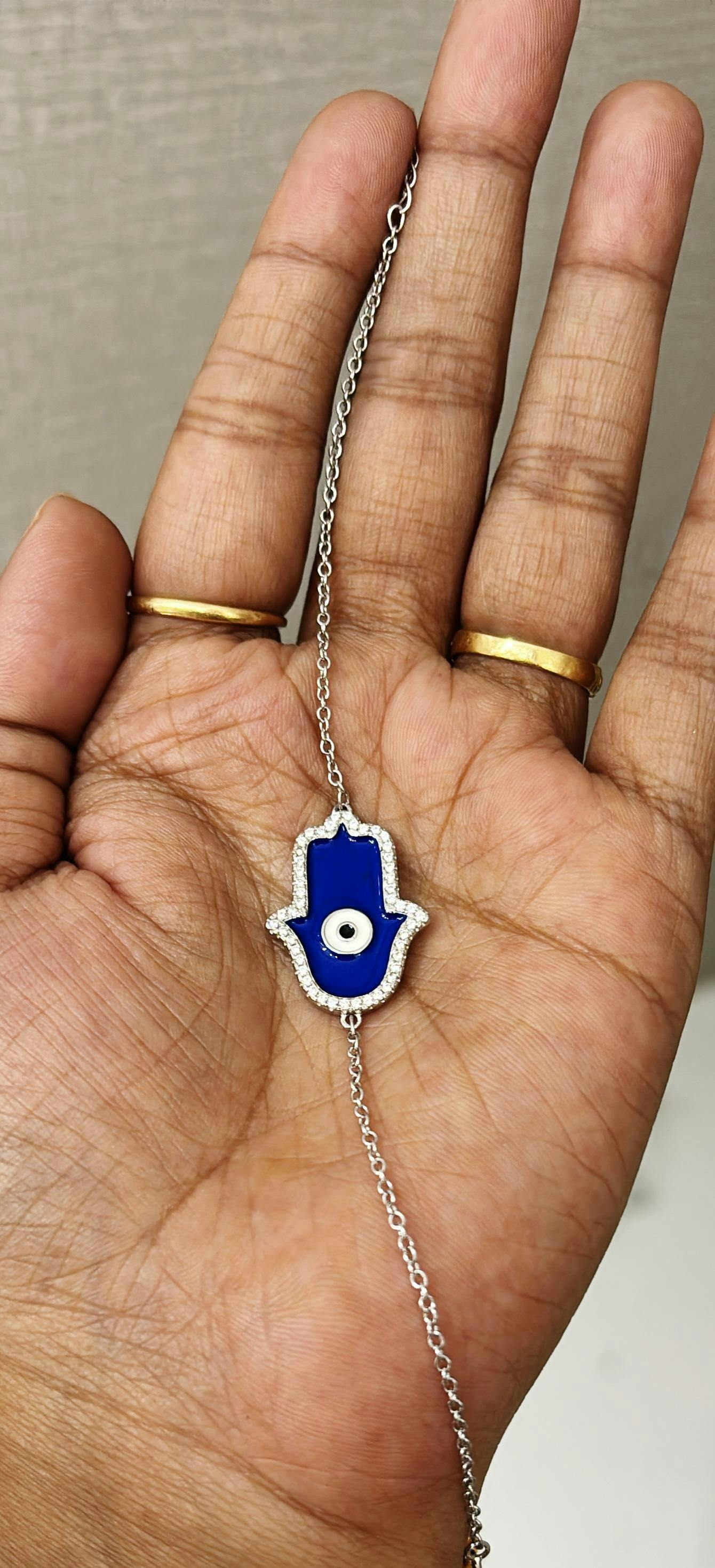 - These 925 Sterling Silver featuring a vibrant blue enamel Hamsa hand with a centered evil eye, outlined in shimmering stones.