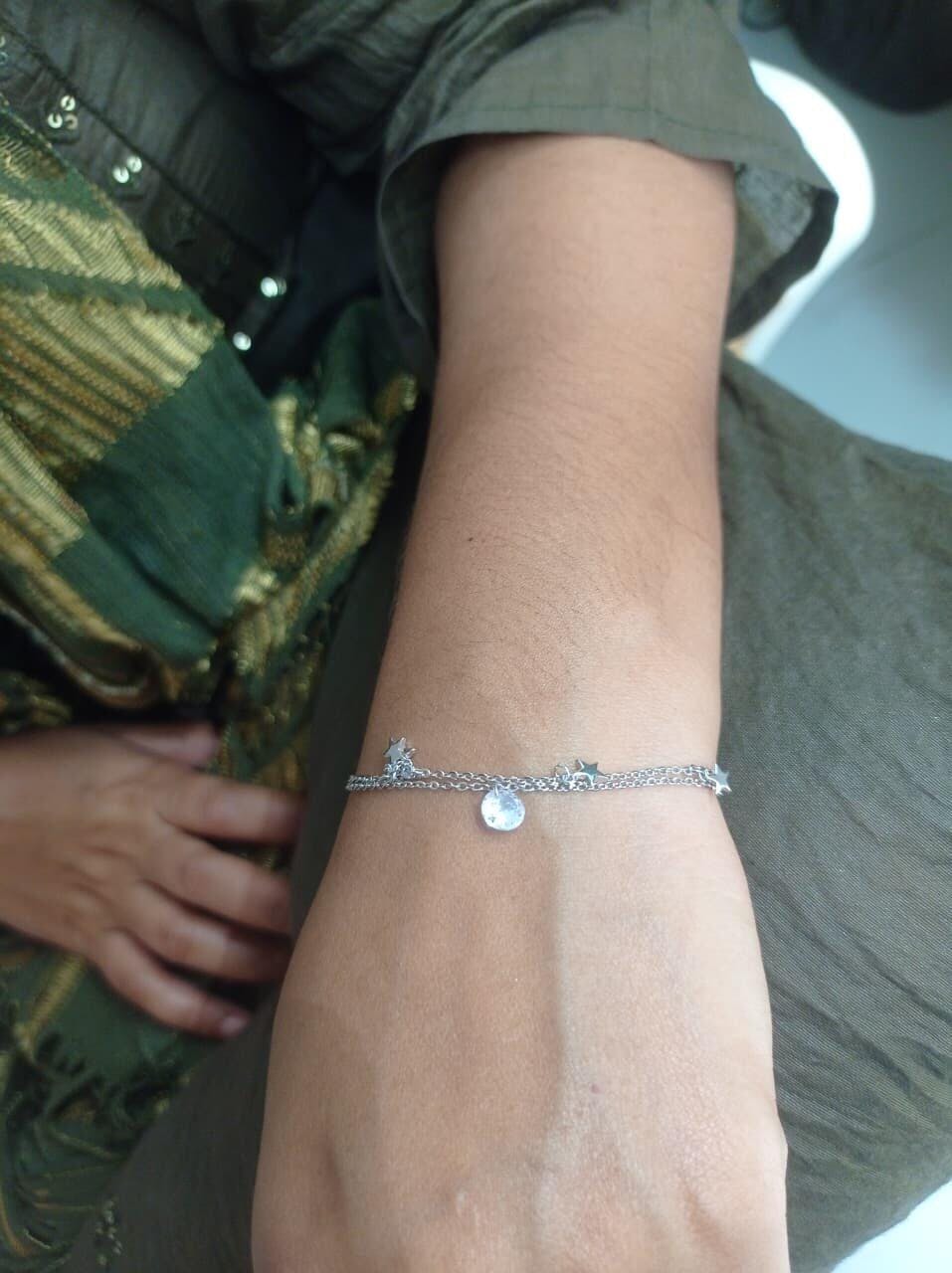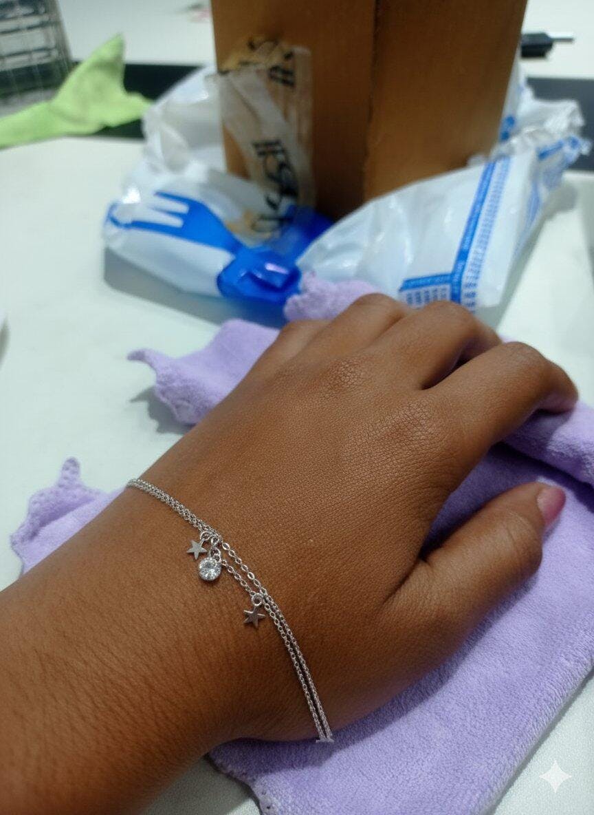 - These 925 Sterling Silver Twinkling like a night sky, this double-layered silver bracelet is adorned with dangling star charms and a central sparkling crystal.