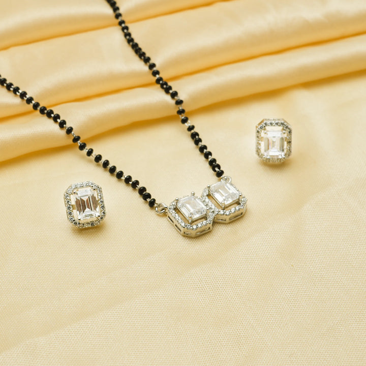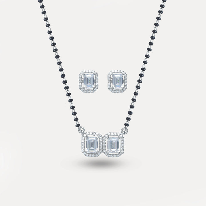 - These 925 Sterling Silver. mangalsutra set is adorned with twin emerald-cut zirconia stones, framed by a halo of sparkling accents. Paired with matching stud earrings
