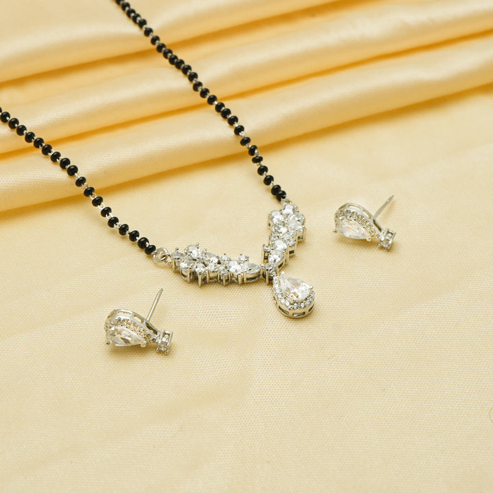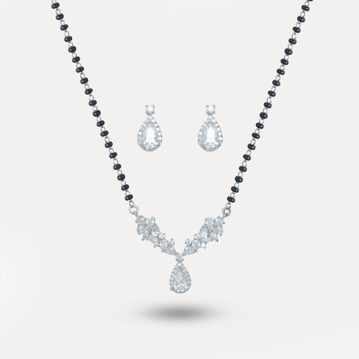 - These 925 Sterling Silver. mangalsutra set is designed with a sparkling teardrop pendant encrusted with shimmering zirconia stones. The V-shaped cluster detail adds sophistication, while the matching teardrop earrings