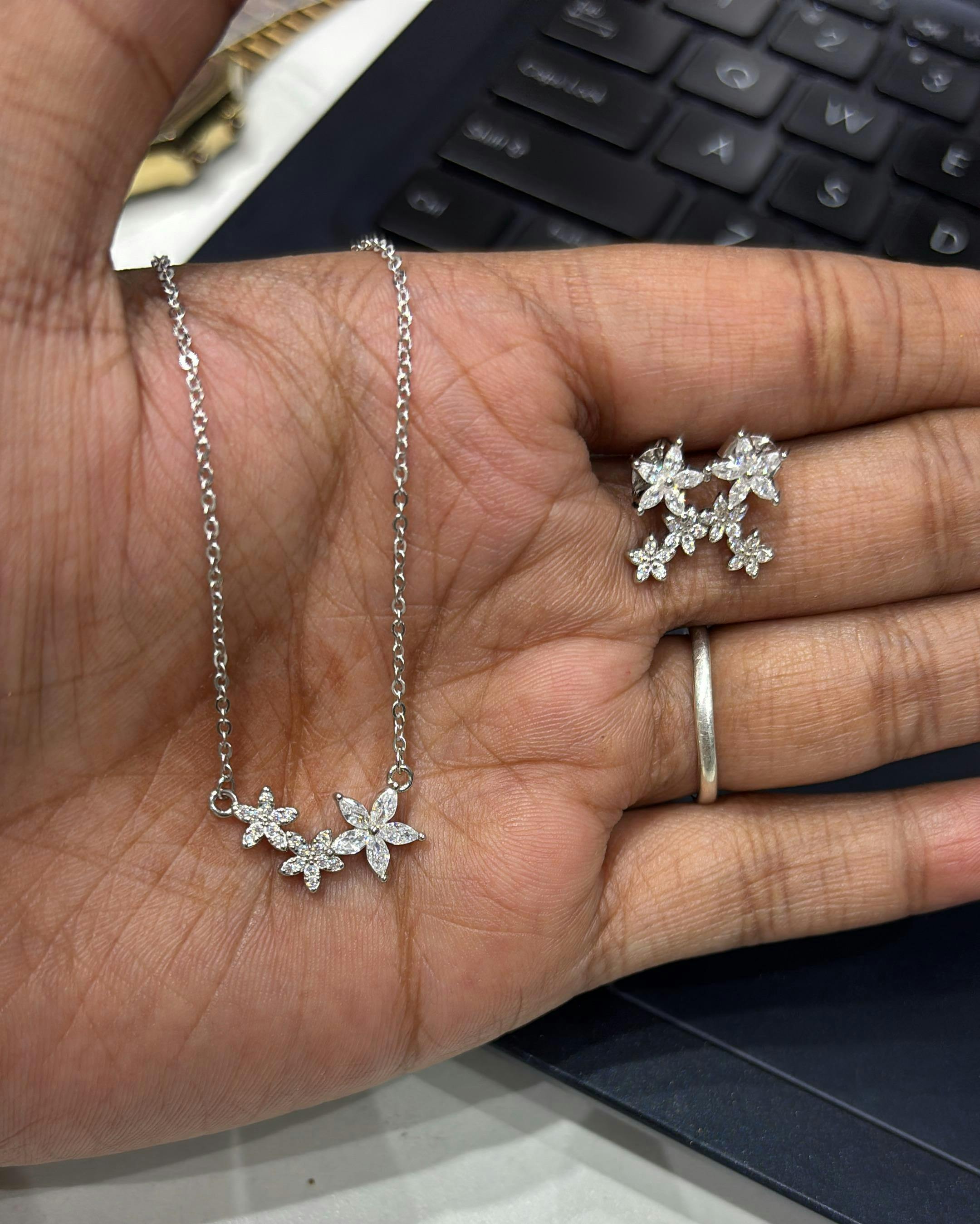 - These 925 Sterling Silver dainty silver necklace and matching earrings featuring a trio of shimmering flowers for a delicate, feminine touch