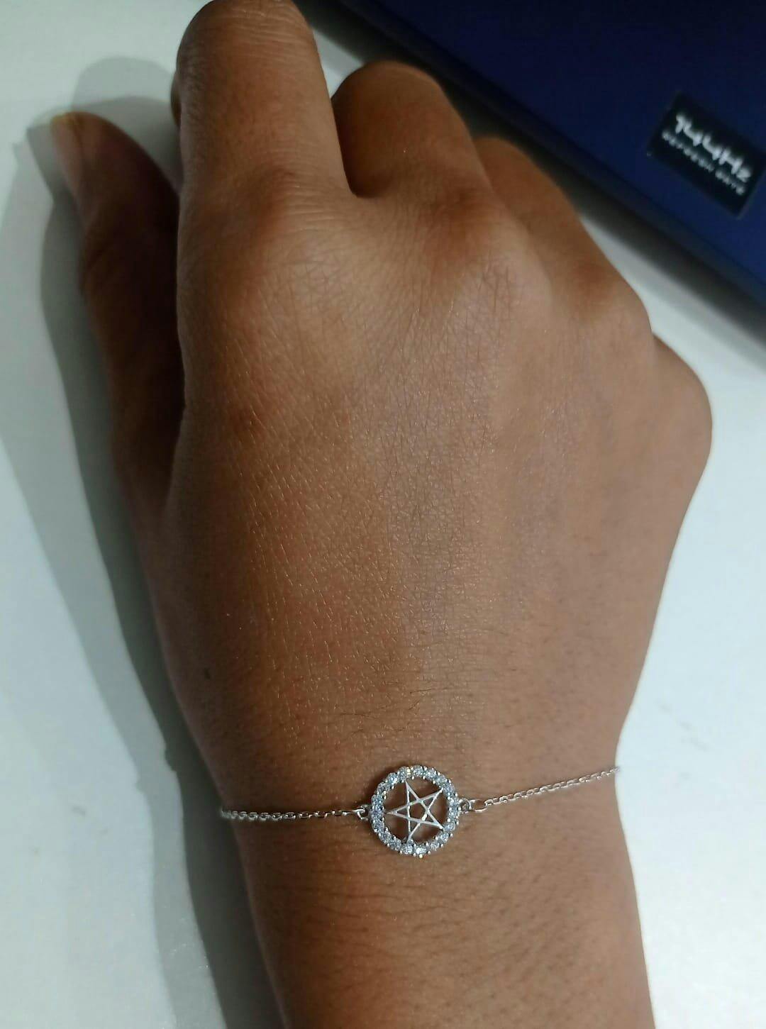 - This 925 Sterling Silver delicate bracelet features a circle charm embellished with sparkling stones, creating a celestial-inspired design.