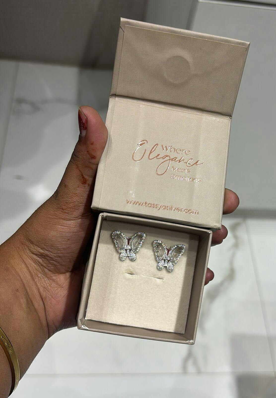 - These 925 Sterling Silver A poetic fusion of elegance and sparkle, these butterfly studs shimmer with finely set zirconia and crystal-clear wings capturing the essence of transformation and timeless beauty.